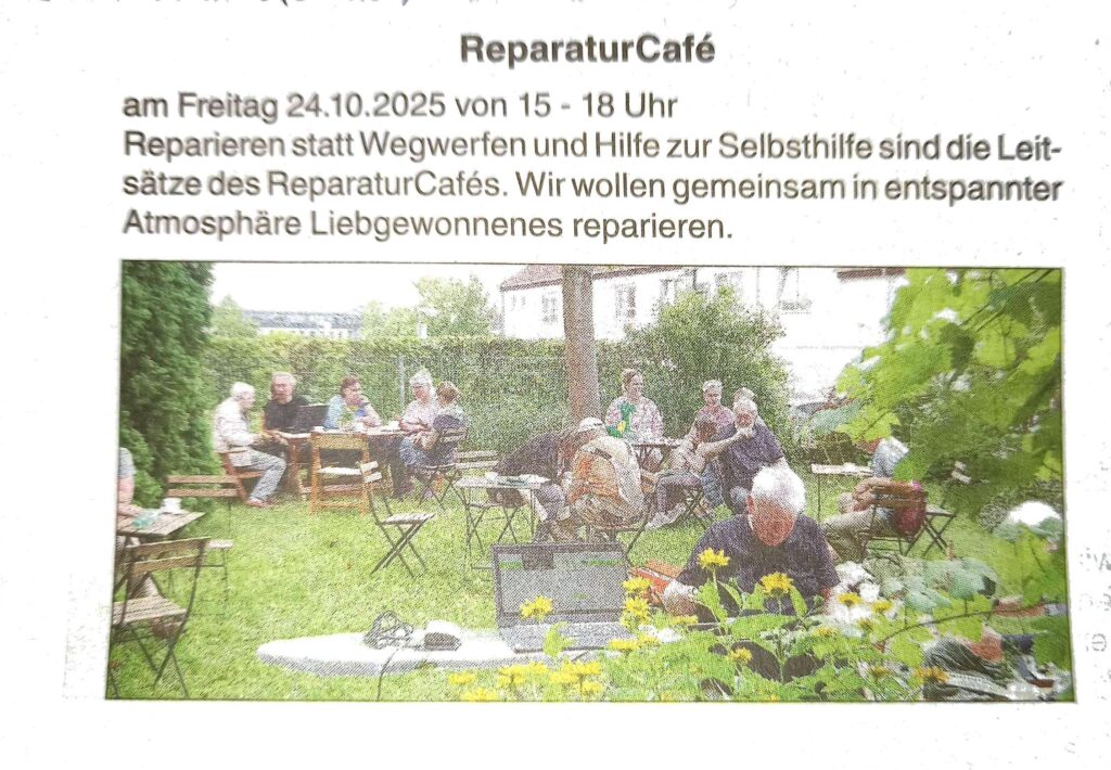 Reparatur-Cafés sind ehrenamtliche Treffen, bei denen die Teilnehmer alleine oder gemeinsam mit anderen ihre kaputten Dinge reparieren. An den Orten, an denen das ReparaturCafé stattfindet, ist Werkzeug und Material für alle möglichen Reparaturen vorhanden. Zum Beispiel für Kleidung, Möbel, elektrische Geräte, Fahrräder, Spielzeug und vieles mehr. Auch sind kundige ehrenamtliche Helfer anwesend, die Reparaturkenntnisse und –fertigkeiten auf verschiedenen Gebieten mitbringen.